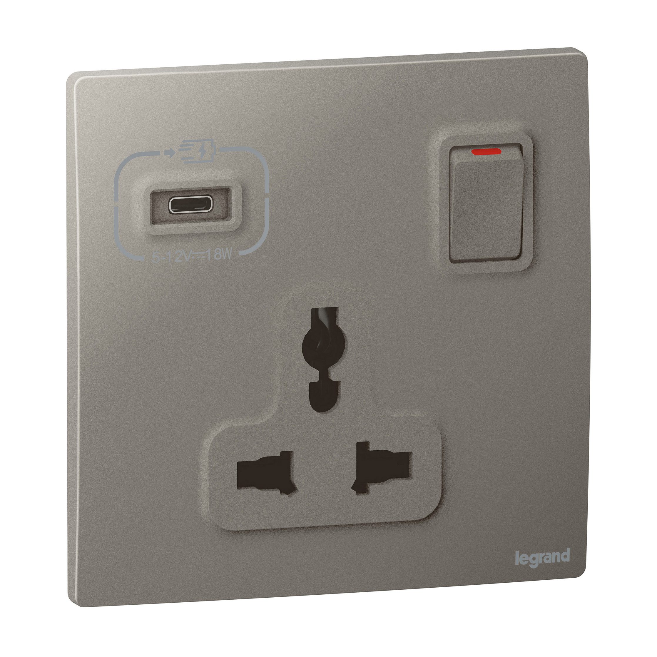 Mallia Senses 1 gang Multistandard switched socket outlet – with USB C 18W charger.