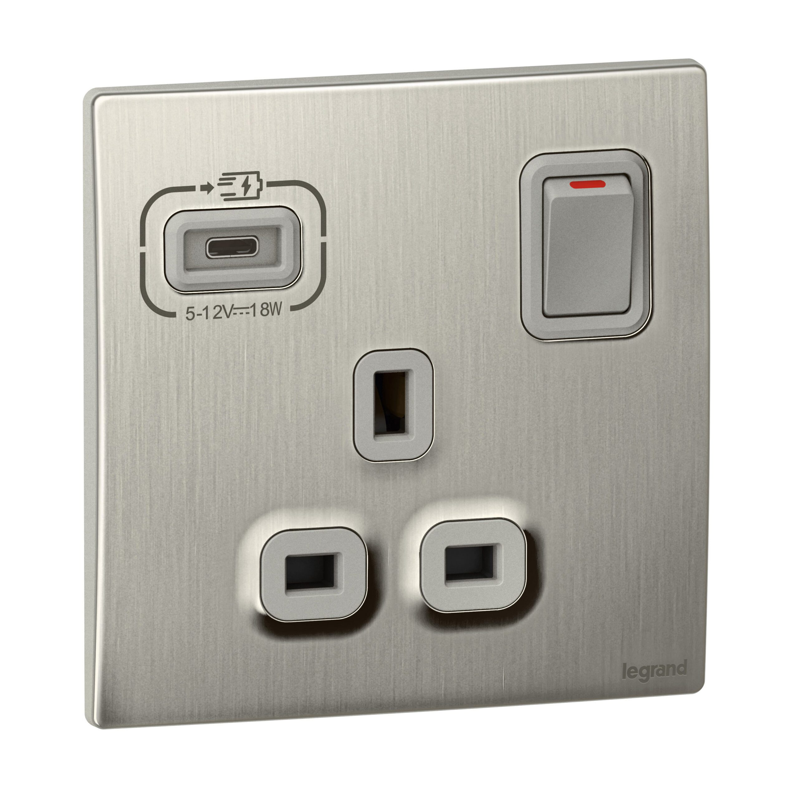 Mallia Senses 1 gang single pole switched socket outlet – with USB C 18W charger.