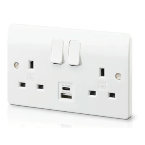 MK Logic Plus 2 Gang 13 Amp + 1xUSB-A and 1xUSB-C Switched Socket Outlet.