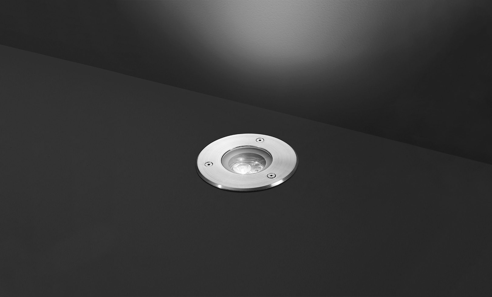 Round ground-recessed luminaire for oudoor installation, Phospho-chromatised and polyester powder coated die-cast aluminium body and stainless steel AISI 304 frame, tempered safety glass, moulded silicone gasket. Built-in LED driver 220-240V 50-60Hz, with 3 CREE XP-G2 LED. IP67 rating.