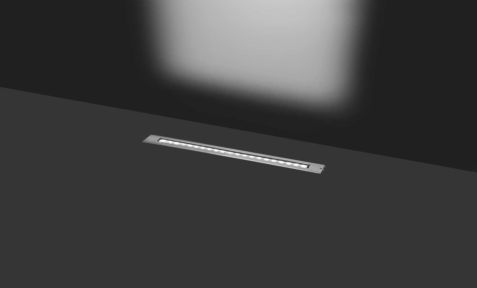Linear ground-recessed luminaire for outdoor installation, length 500mm, Phospho-chromatised and polyester powder coated extruded copper-free aluminium body and stainless steel AISI 304 frame, tempered safety glass, moulded silicone gaskets, stainless steel recessing sleeve. Special optics with “invisa-light” technology. Built-in LED driver 220-240V 50-60Hz, with 17 CREE XP-G2 LED. IP67 rating.