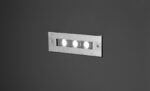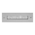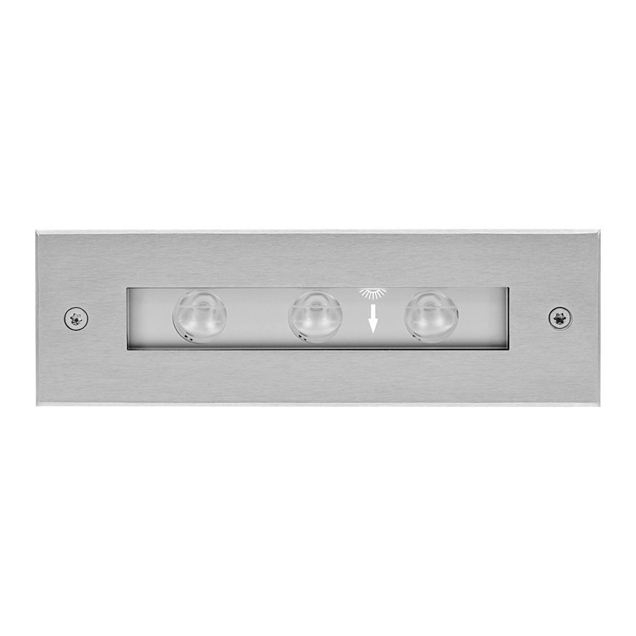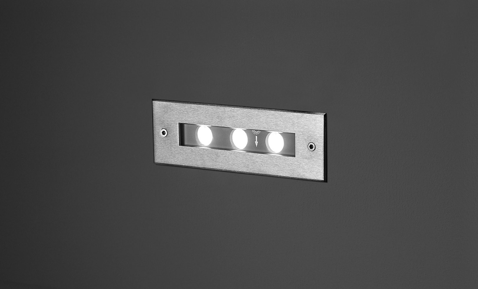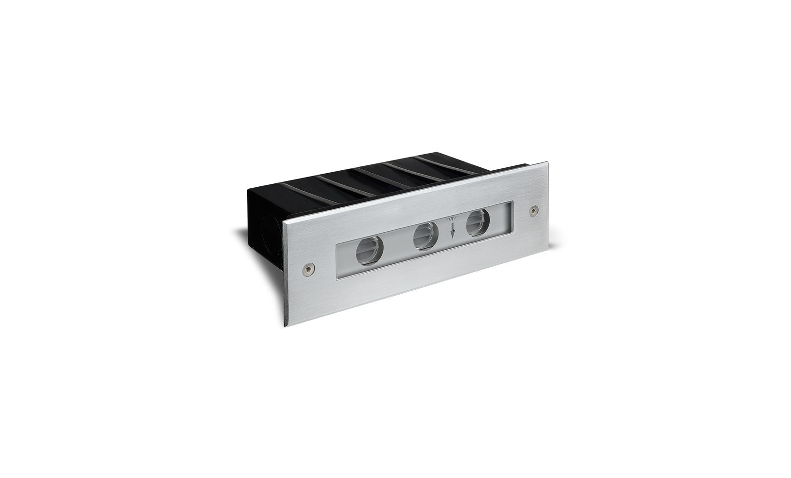 Recessed linear steplight for outdoor installation in the wall, asymmetrical light distribution, phospho-chromatised and polyester powder coated die-cast aluminium body, stainless steel frame, tempered clear glass, polypropilene housing for recess, moulded silicone gasket and stainless steel screws. Built-in LED driver 220-240V 50-60Hz, with 3 high-power OSRAM LED. IP65 rating.